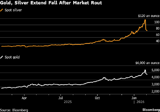 上周五暴跌的导火索是美国总统唐纳德・特朗普提名凯文・沃什出任美联储主席的消息,该消息推动美元走高,重创押注特朗普会放任美元贬值的投资者情绪。交易员认为沃什是最终候选人中立场最强硬的抗通胀派,这推升了市场对紧缩货币政策的预期,而紧缩政策将支撑美元走强,打压以美元计价的贵金属价格。