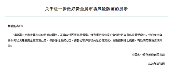 2月2日,农业银行(601288)发布《关于进一步做好贵金属市场风险防范的提示》称,近期国内外贵金属市场价格波动剧烈,不确定性显著增强。农业银行提示客户审慎评估自身风险承受能力,综合考虑自身财务状况开展贵金属交易业务,保持理性投资心态,密切关注市场变化,合理控制持仓规模,有效防范市场波动风险。