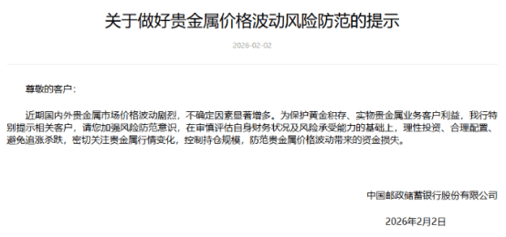 2月2日,邮储银行发布《关于做好贵金属价格波动风险防范的提示》称,近期国内外贵金属市场价格波动剧烈,不确定因素显著增多。为保护黄金积存、实物贵金属业务客户利益,特别提示相关客户,请加强风险防范意识,在审慎评估自身财务状况及风险承受能力的基础上,理性投资、合理配置、避免追涨杀跌,密切关注贵金属行情变化,控制持仓规模,防范贵金属价格波动带来的资金损失。