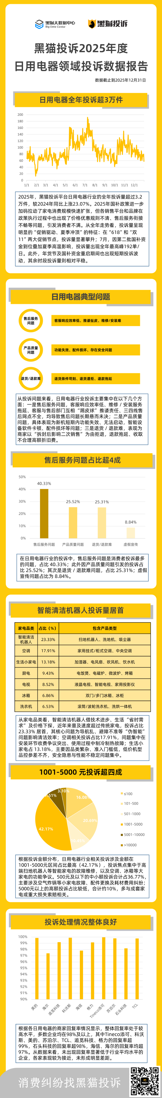 从投诉问题来看,日用电器行业投诉主要集中在以下几个方面:一是售后服务问题, *** 响应效率低、维修 / 安装服务拖延、 *** 与售后部门互相 “踢皮球” 推诿责任、三四线售后网点不全,均导致售后问题长期悬而未决;二是产品质量问题,具体表现为新机短期内功能失效、无法启动,智能设备软件卡顿、配件损坏等问题;三是退货 / 退款难,表现为商家以 “拆封后影响二次销售” 为由拒退,退款拖延、收取不合理高额折旧费。