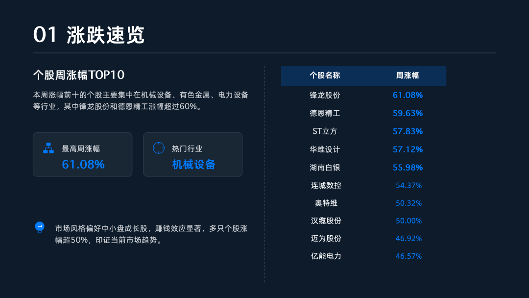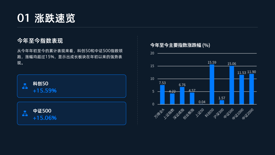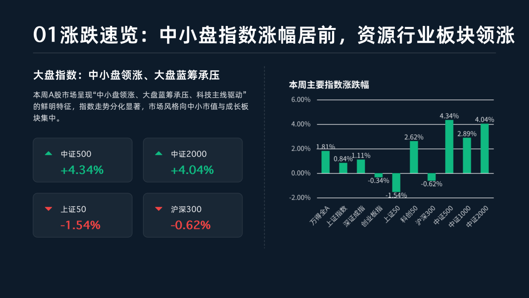 本周(2026年1月19日至1月23日)A股市场整体表现为“中小盘领涨、大盘蓝筹承压” 。在科技主线驱动与资源板块发力的共同作用下,市场风格明显向中小市值与成长板块集中 。从指数表现看,代表中小微盘的中证2000与中证500分别录得4.04%和4.34%的显著涨幅,科创50亦表现亮眼,上涨2.62% 。相比之下,权重蓝筹股走势疲软,上证50与沪深300本周分别下跌1.54%和0.62%,反映出指数层面的显著分化 。