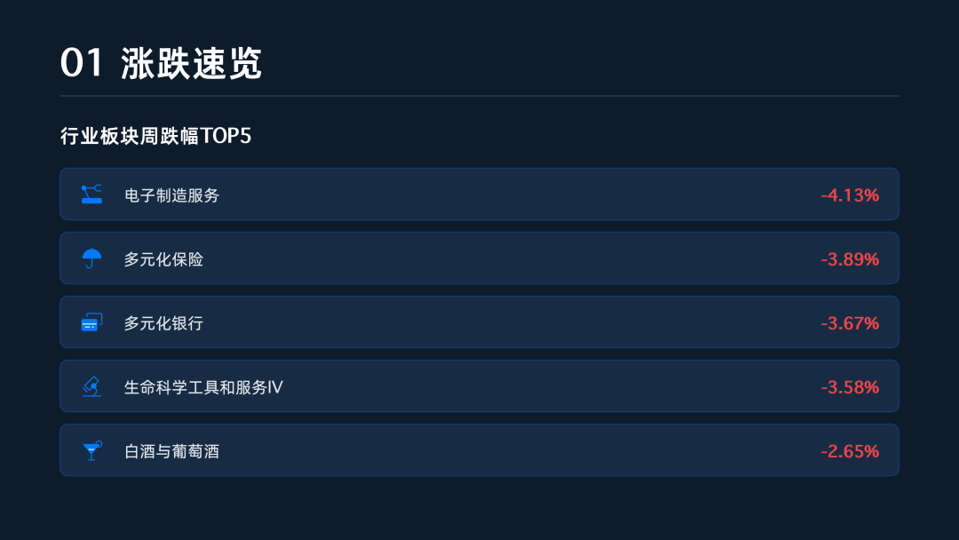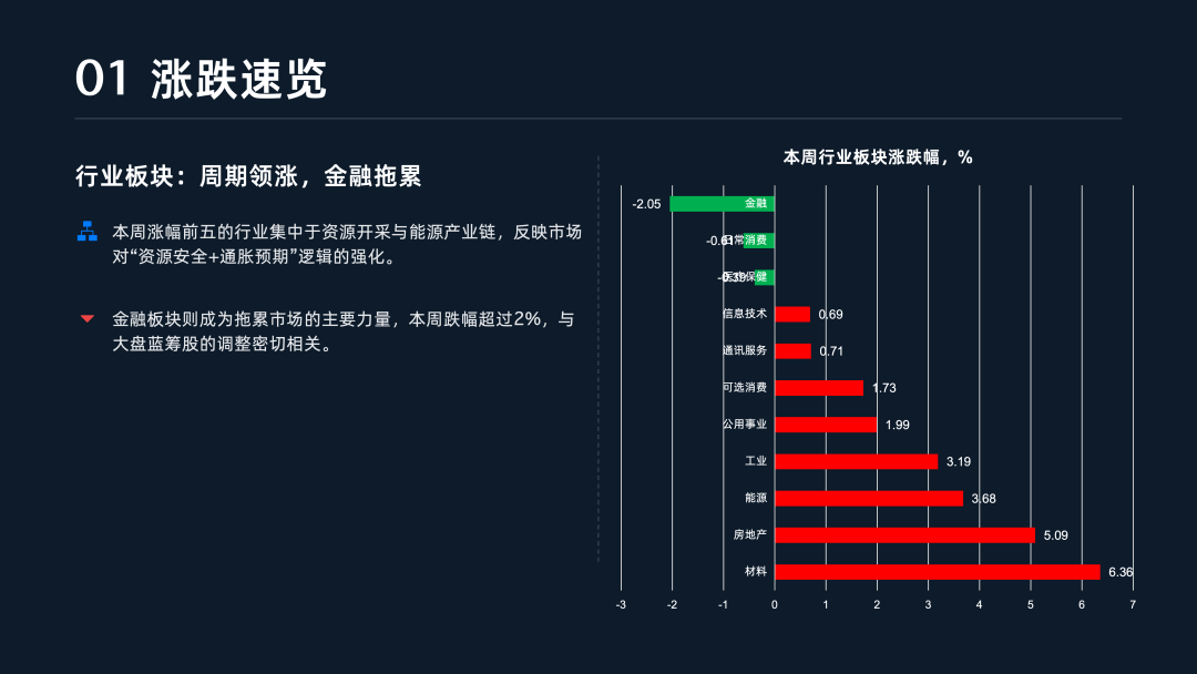 行业板块方面,资源与能源产业链成为本周最亮眼的明星,市场对“资源安全+通胀预期”的逻辑给予了认可 。材料行业以6.36%的周涨幅领跑全场,房地产、能源与工业板块紧随其后 。特别是在细分领域,贵金属与矿石板块单周涨幅高达19.00%,反映出资金在通胀逻辑下的强力进攻 。相比之下,金融、日常消费及医疗保健板块表现相对低迷,其中金融行业受银行、保险拖累整体下跌2.05%,成为市场主要的压制力量 。