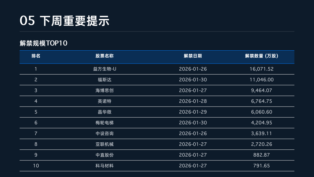 资金流向与后市关注方面,尽管主力资金全周累计净流出约124.45亿元,但尾盘资金连续三日呈现积极回流态势,尤其在周五尾盘净流入超30亿元,显示出短期博弈情绪正在修复 。展望下周,投资者需重点关注业绩预告的“试金石”效应,届时将有117家公司披露2025年业绩预告,其中航空航天与国防、电气部件与设备行业分布最为集中 。此外,下周还将迎来3只新股申购以及超6.31亿股的限售股解禁。