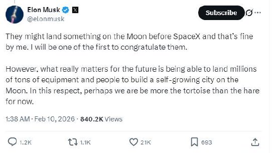 马斯克回应称:“他们或许会比 SpaceX 更早登上月球,对此我并不介意。我会是之一批向他们表示祝贺的人。”