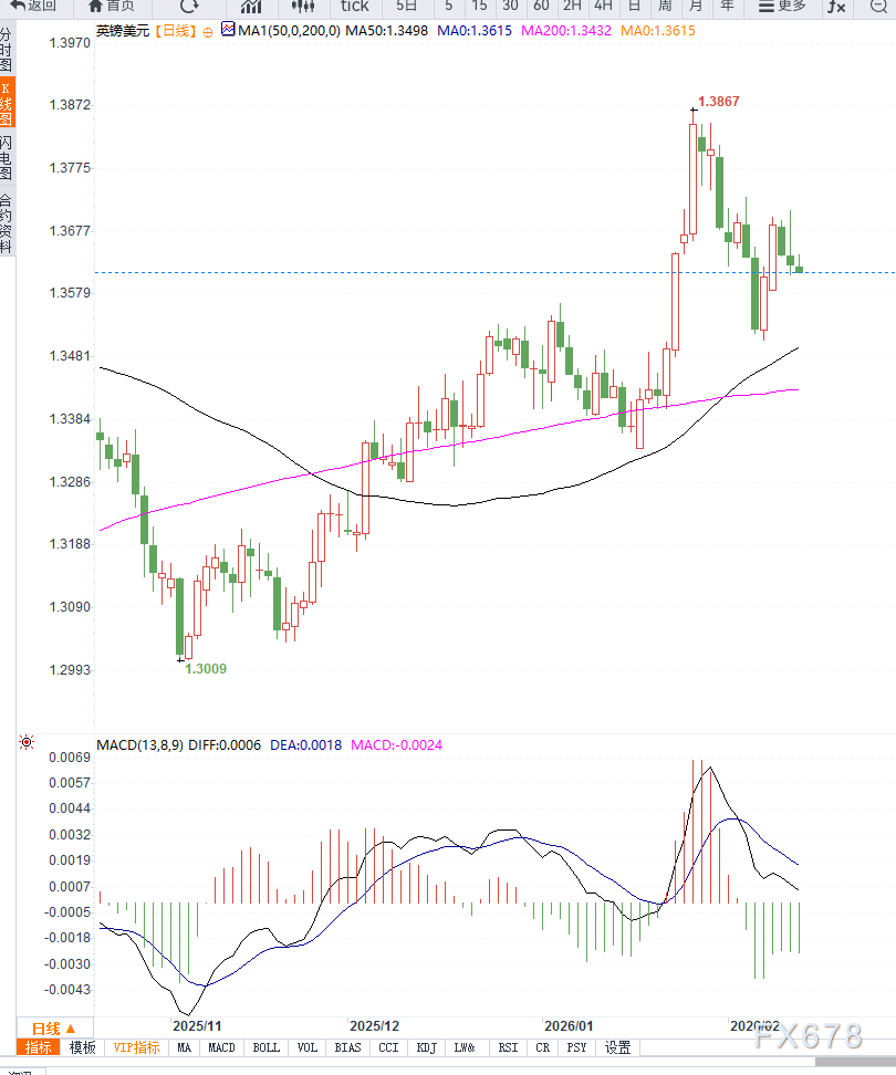 布林带结构显示,价格运行在中轨(1.3618)上方,且布林带通道出现扩张迹象,表明波动率提升并伴随潜在趋势延续。若多头动能持续,汇价可能向上测试2月11日高点1.3713。