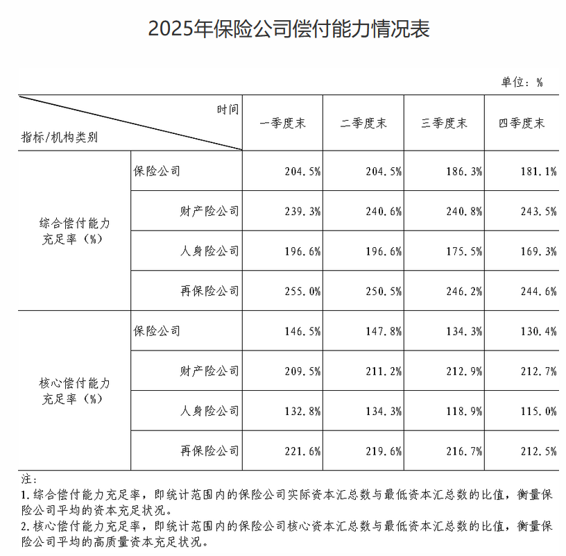 2月12日金融一线消息,国家金融监督管理总局发布2025年保险公司偿付能力情况。四季度末保险公司综合偿付能力充足率181.1%,核心偿付能力充足率130.4%。