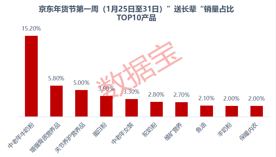 横向来看,“中老年牛奶粉”的销量占比遥遥领先,超过15%,成为送长辈首选;位居次位的是“增强骨质营养品”,销量占比为5.8%;中老年女装、保暖内衣销量占比分别为3.3%、2.0%,分别位居第五、第十位。