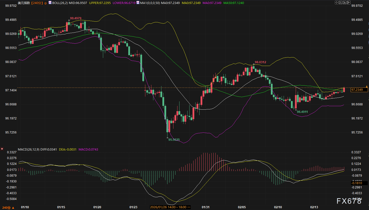 从240分钟图看,美元指数走出V型反转,自95.56低点反弹后,近期连续收小阳线,节奏平稳,显示低位买盘活跃。