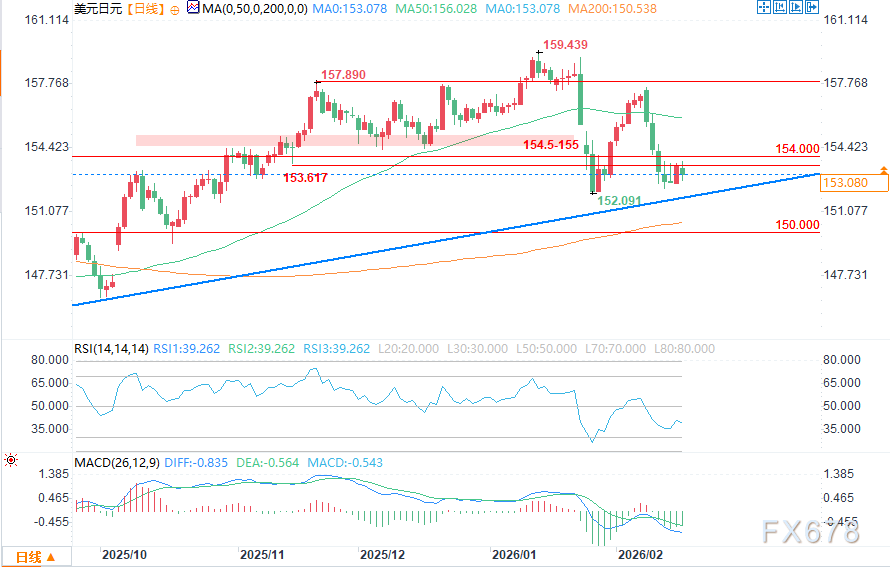 受美国总统日假期影响,本周外汇市场开局平静,交易员持观望态度,静待美联储FOMC会议纪要、美国GDP初值等关键数据,美元整体呈稳健整理态势。截至2月17日20时30分许,美元兑多数货币延续反弹,美元兑日元报153.14(小幅回落0.37),欧元、英镑兑美元小幅走弱,呼应美元稳健格局。