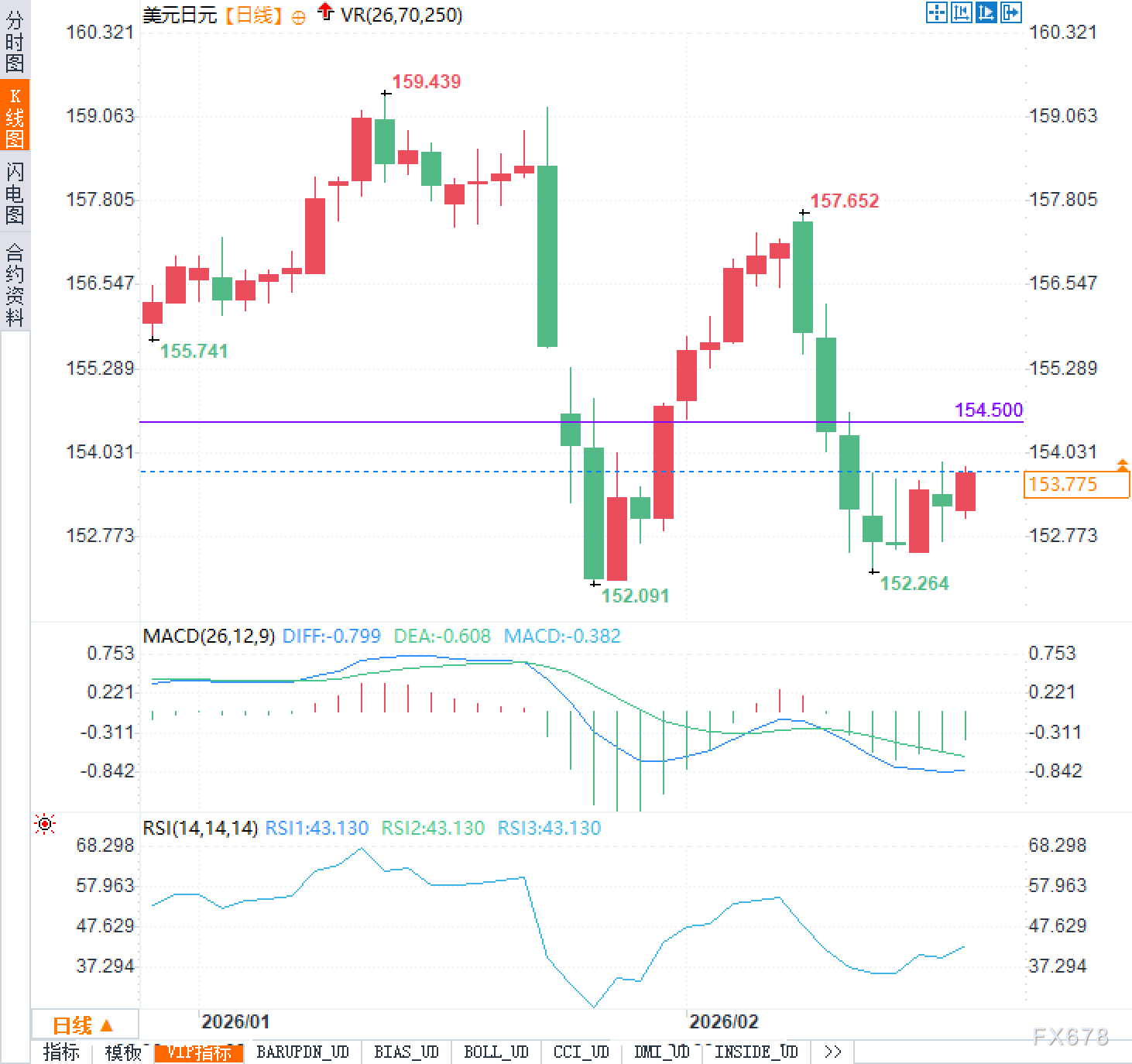 技术面上,战场的界限已划得十分清晰。上方154.500附近构成了近端的压力带,若多头能收复并站稳此位,短线有望推动价格向156.50一带回补,打开上行空间;反之,若反弹在此处再度受压,则说明此前的修复仅是下跌趋势中的短暂休整。下方则需密切关注152.264与152.091两个低点组成的防线,一旦有效跌破,极易触发止损盘与趋势跟随盘,从而打开更深的回撤空间。动能指标同样偏向谨慎:MACD处在零轴下方且柱体偏弱,表明中期下行动能尚未完全消退;RSI在43.130附近徘徊,属于偏弱但未极端的区间,意味着市场更像是在进行“弱势盘整”,而非单边加速。