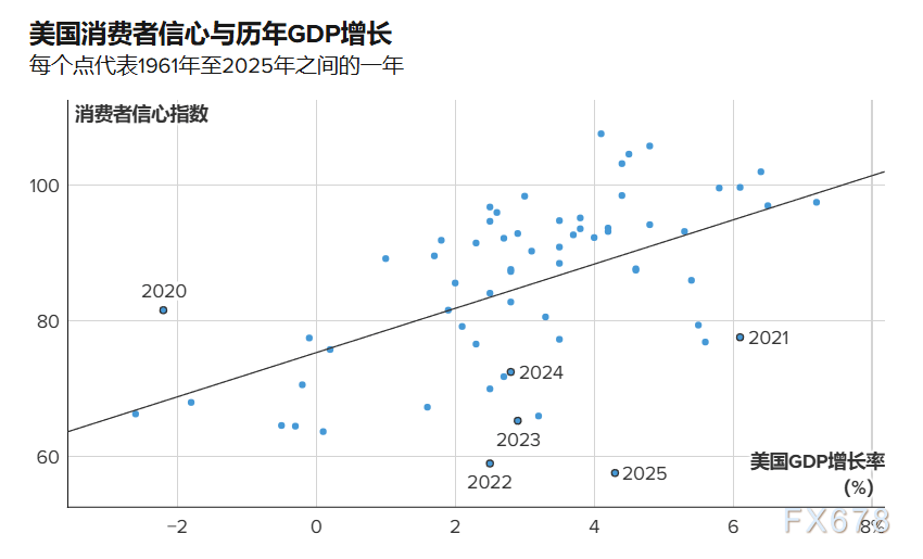 斯托勒表示,从表面上看,“繁荣式衰退”理论有助于解释为什么近年来的数据显示美国GDP增长并未带来消费者情绪的提升,这与过去六十年间观察到的典型趋势形成了显著背离。
