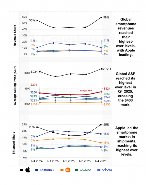 Counterpoint Research的报告显示,2025年第四季度,苹果一家就独揽了全球市场59%的营收份额,而综合多份报告显示,苹果长期占据着全球智能手机市场超80%的利润,高端市场的马太效应已达极致。