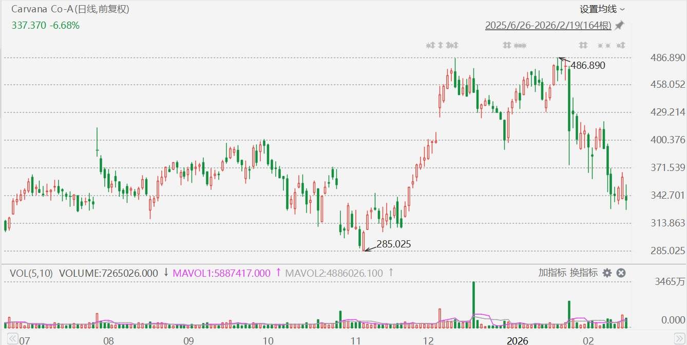汽车买卖电商平台Carvana(CVNA.US)盘中一度跌超9%,报328美元。消息面上,公司公布业绩显示,2025年第四季度Carvana零售销量达163522辆,同比增长43%;季度总收入达56.03亿美元,同比增长58%;第四季度净利润达9.51亿美元,净利润利润率为17.0%,均创历史新高。