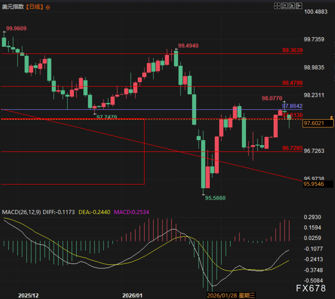 技术面美元指数本月两次尝试挑战97.86的多空分解线,最终未站上,目前压力位在此价格水平以及97.61的箱体上轨。