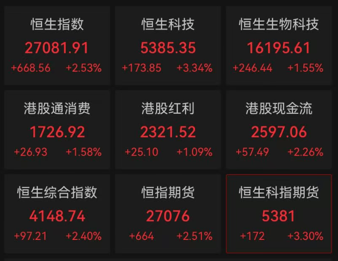 2月23日,港股大涨。截至收盘,恒指涨2.53%,恒生科技指数涨3.34%。