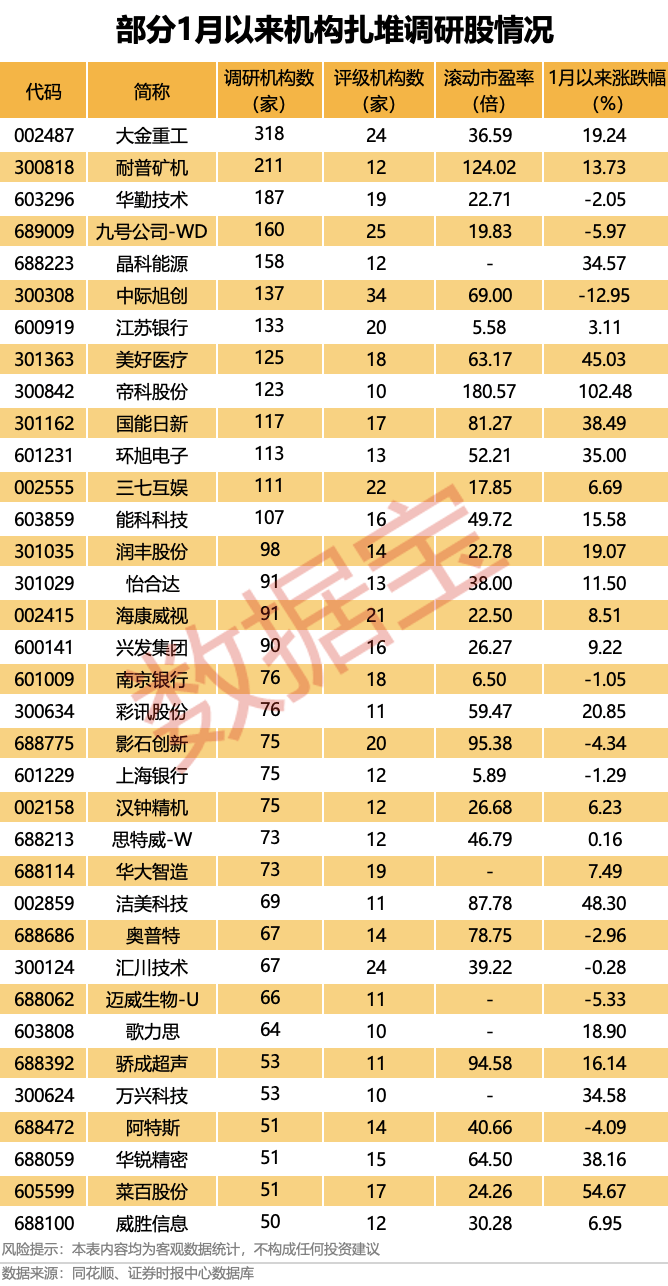 据证券时报・数据宝统计,1月以来,调研机构数在50家及以上且评级机构数在10家及以上的公司,合计有35家。