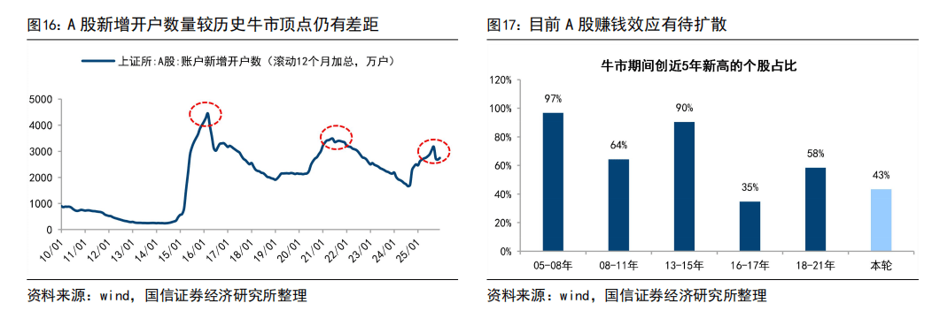 目前A股市场情绪尚未明显过热,新增开户数量和市场赚钱效应还未创新高。股价大涨的数量,也与过去多轮牛市期间仍有距离。