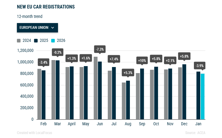 2026年1月,电动车注册了154,230辆。欧盟四个更大市场合计占电池电动车注册量的60%,表现参差不齐:法国(+52.1%)和德国(+23.8%)实现强劲增长,而比利时(-11.5%)和荷兰(-35.4%)则出现下降。