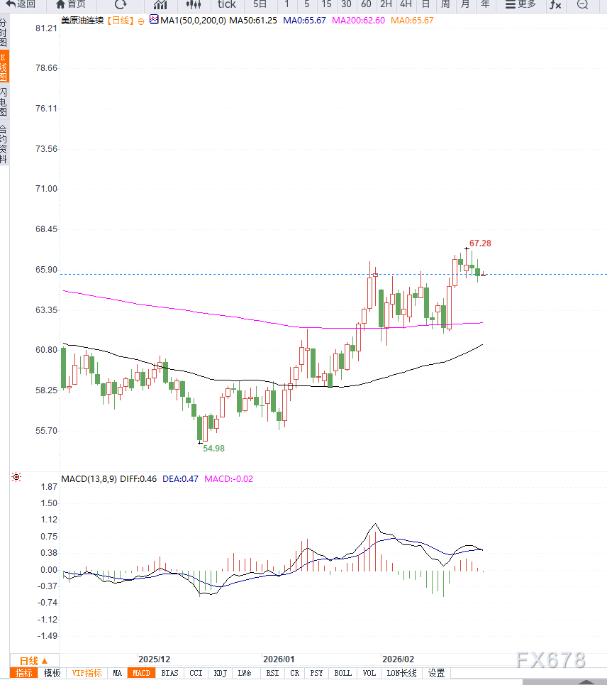 成品油库存则呈现分化,汽油库存减少100万桶,显示终端消费仍具一定韧性,而馏分油库存增加25.2万桶,反映工业与运输需求修复力度有限。尽管库存数据显著利空,但油价并未出现深度下挫,原因在于地缘局势不确定性持续支撑风险溢价。新一轮核问题谈判将在日内瓦举行,美国总统唐纳德・特朗普重申不会允许伊朗拥有核武能力,使市场对中东供应中断的担忧升温。同时,沙特 *** 据称已准备短期增产预案,以防潜在冲突影响出口。OPEC+方面也传出可能在4月增产13.7万桶/日的消息。从日线结构观察,WTI原油当前仍处于中期震荡区间内部运行,价格波动核心区间维持在60美元至72美元之间。近期油价连续回落但跌幅有限,说明下方承接力量仍在发挥作用。20日均线走平,价格围绕均线反复震荡,显示短期趋势缺乏方向性突破;50日均线位于63美元附近,构成中期动态支撑。动能指标RSI位于50中轴附近,既未进入超买区也未触及超卖区,反映市场情绪处于平衡状态。当前65美元位置属于区间中轴区域,多空力量相对均衡。若库存压力持续释放并叠加OPEC+增产兑现,油价可能下探63美元一线,进一步支撑位在60美元整数关口;若地缘风险升级推动突破67.5美元,则上方目标将指向70美元甚至72美元区域。整体技术形态尚未形成趋势性突破,震荡格局依然是主基调。