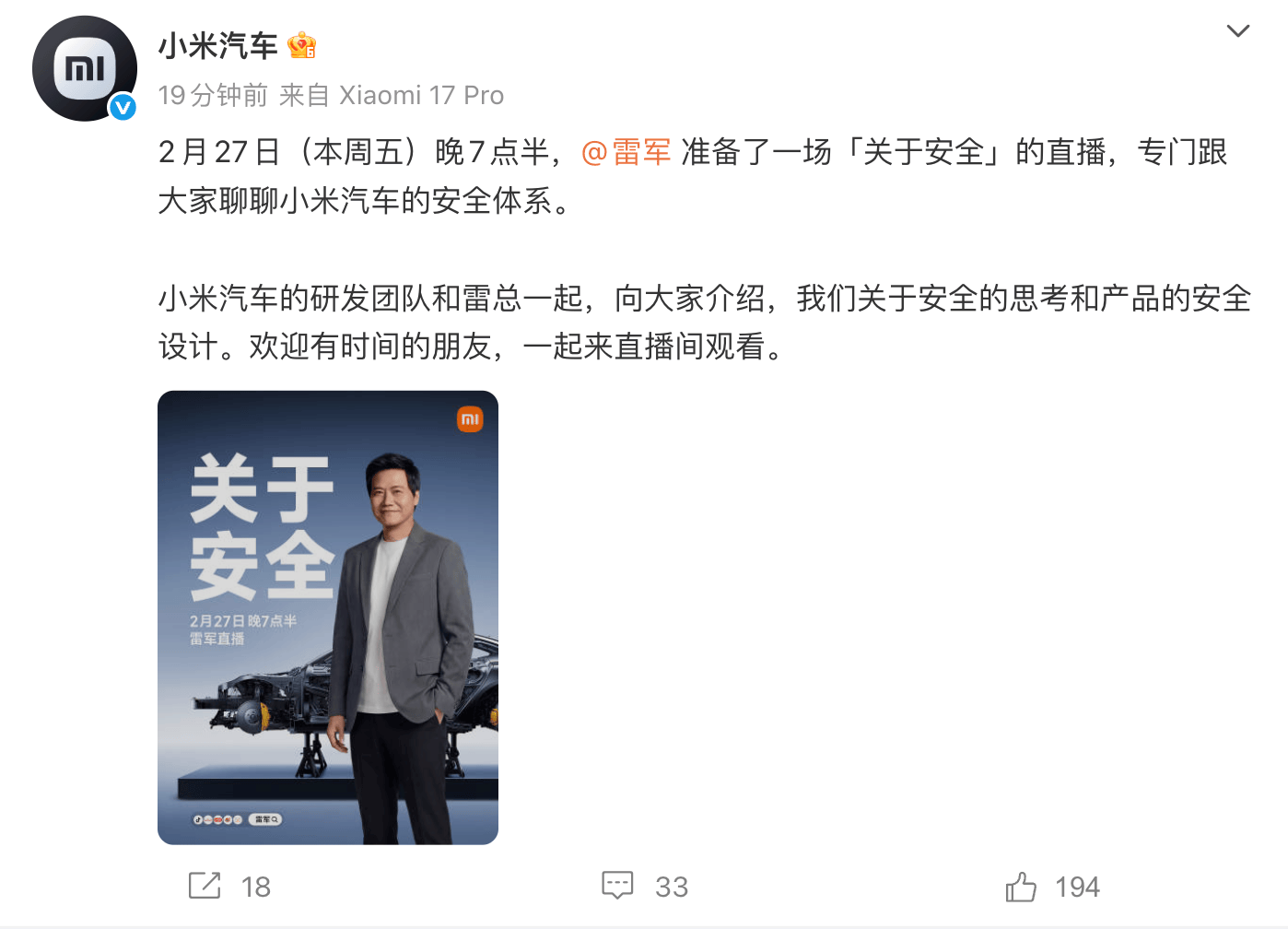 凤凰网科技讯 小米汽车官方宣布,2月27日(本周五)晚7点半,雷军准备了一场“关于安全”的直播,专门跟大家聊聊小米汽车的安全体系。