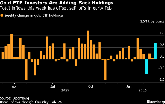 随着市场企稳,投资者也在增持黄金ETF。截至本周四的资金流入,已完全抵消了本月早些时候的抛售规模。
