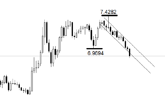 行情方面,月线级别,美元兑离岸人民币处于图中下降通道之内。月线级别的中期低点在6.9694,月线级别的中期高点在7.4282。当前的下跌波段正在寻找新的中期低点。关键支撑位6.9694已经被跌破。下方没有明显的技术性支撑,预计跌势还将延续数月。