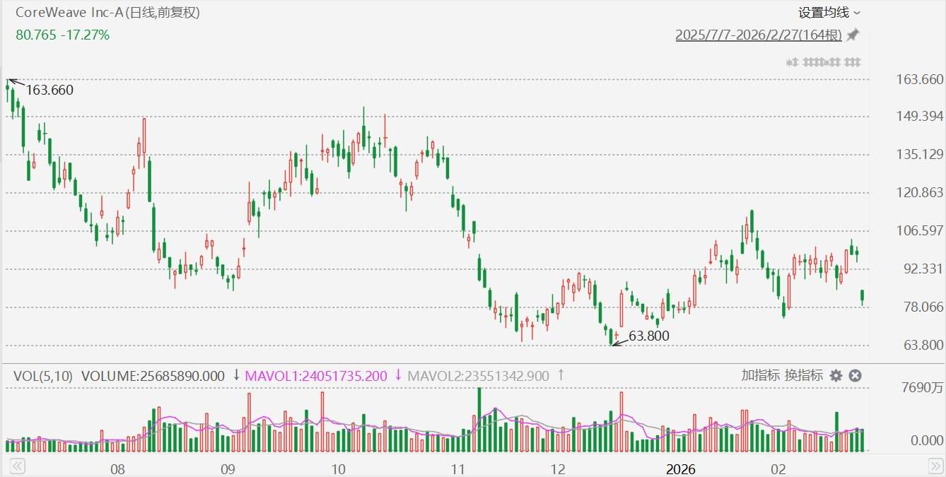 CoreWeave(CRWV.US)盘中一度大跌超19%报78.87美元,跌幅创8月以来更大。消息面上,CoreWeaveQ4 EPS亏损0.89美元,同比扩大1.6倍,为分析师预期的四倍多,营业同比由盈转亏8900万美元,净亏损4.52亿美元几乎为一年前9倍。公司预计2026年资本支出至少300亿美元、至少为2025年三倍,到年底ARR收入多达190亿。