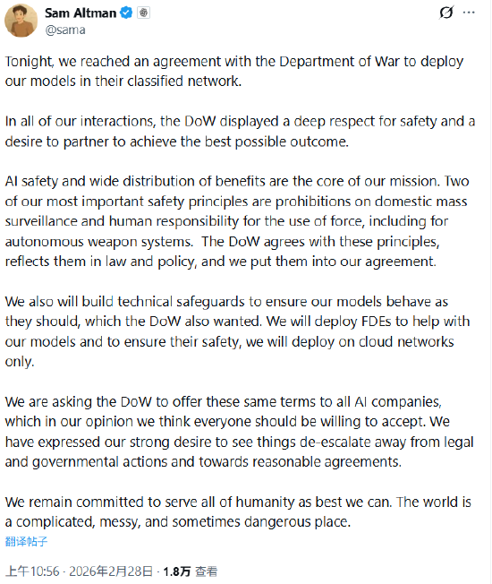 OpenAI创始人奥特曼在社媒发文称,今晚,OpenAI与“战争部”(美国防部)达成协议,将在其机密 *** 中部署OpenAI的模型。