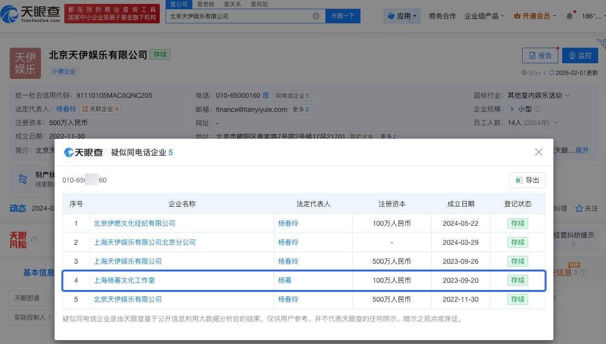 天眼查工商信息显示,天伊娱乐关联北京天伊娱乐有限公司成立于2022年11月,法定代表人为杨春玲,注册资本500万人民币,经营范围包括剧本娱乐活动、组织文化艺术交流活动等。股东信息显示,该公司由杨幂母亲杨春玲、诗摇、共青城尘星及月投资有限公司共同持股。