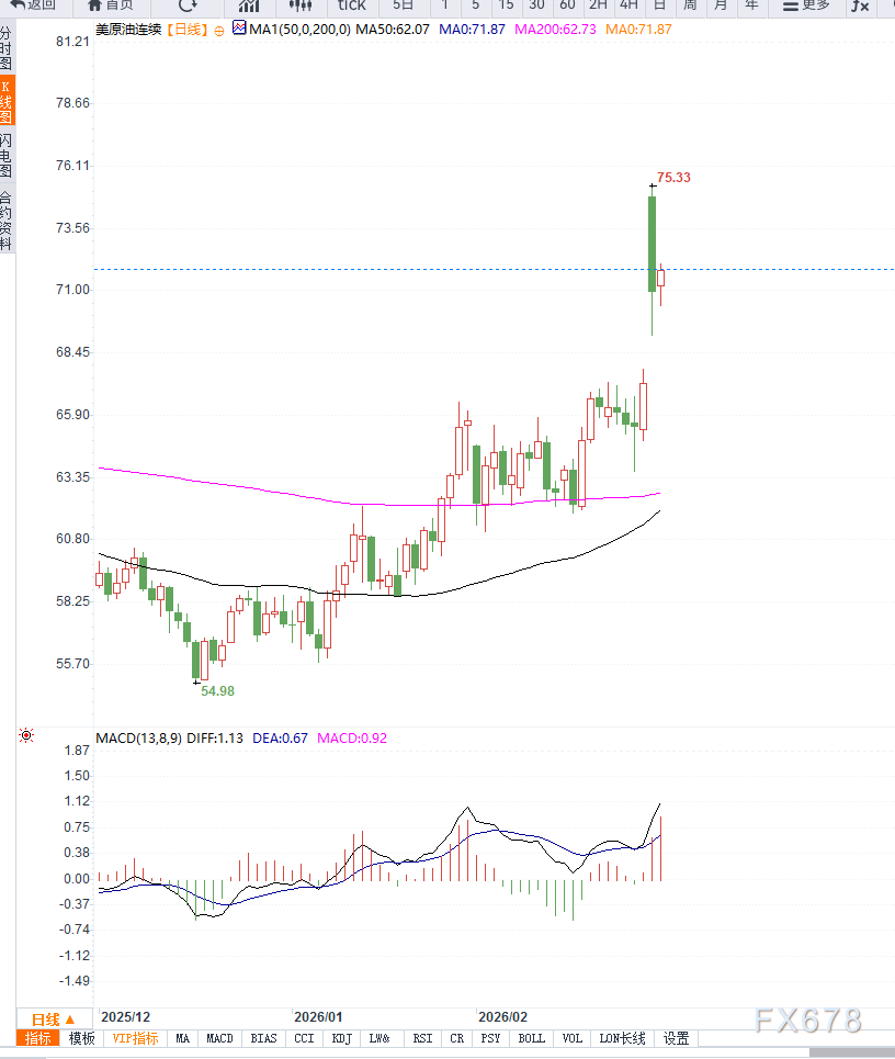 从各大投行观点来看,花旗:短期锚定85美元,尾部风险上看120美元花旗集团将短期布伦特预测上调至85美元/桶,并预计在运输受扰背景下,油价可能维持在80-90美元区间运行。更激进情景下,若区域油气基础设施遭受直接打击,布伦特存在冲击120美元的可能性,相关概率被评估为20%。这一推演强调的并非单纯供需缺口,而是“运输可达性”问题。汇丰:闲置产能无法替代运输通道汇丰银行指出,OPEC+约460万桶/日闲置产能的实际作用取决于运输条件。每日约1900万至2000万桶油当量需经由霍尔木兹海峡出口,占全球供应近五分之一。若海峡断航,替代通道能力不足以完全覆盖原有体量,闲置产能可能成为“纸面数字”。这使油价风险呈现明显上行倾斜。物理约束:封锁超过25天或触发被动减产,摩根大通测算显示,海湾产油国陆上与海上储存能力合计最多支撑约25天正常生产。一旦封锁持续更久,储存设施饱和将迫使产油国减产甚至停产。这意味着风险不再只是价格波动,而是供应链的物理中断。风险溢价已部分计入高盛集团认为,当前约18美元/桶的风险溢价,相当于定价六周断航。即便动用备用管道与战略储备,价格冲击仍难完全对冲。油市交易框架已从库存周期转向通道安全周期。从技术面来看,WTI原油走势更具代表性。日线结构WTI日线已完成对前期整理平台的向上突破,价格重新站稳71美元上方。均线系统开始转为多头排列,5日、10日均线向上发散,显示短期趋势扭转。MACD指标在零轴附近形成金叉,红柱逐步放大,动能改善明显。若价格稳固在71美元上方,将打开进一步上探75美元区间的空间。下方之一支撑:71美元。关键阻力位:75美元心理关口。4小时级别4小时图显示,WTI在急涨后进入高位震荡整理阶段。布林带开口扩大,价格围绕上轨运行,短期多头动能仍在。若回踩不破70美元,属于强势整理结构;若跌破该位置,则可能回补跳空缺口至68美元附近。整体来看,趋势偏多,但波动率显著放大。