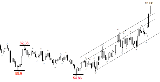 54.86美元至今的上涨浪段,运行在图中所示的上涨通道内部。由于昨日涨幅过大,最新市价已经突破通道线上轨。由于多头过于强势,在下一个顶分形出现之前不建议抱过看空观点。