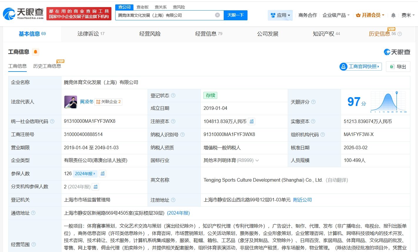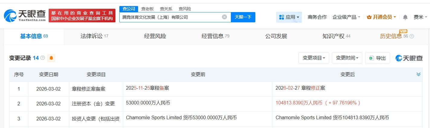 天眼查工商信息显示,近日,腾竞体育文化发展(上海)有限公司发生工商变更,注册资本由5.3亿人民币增至约10.5亿人民币,增幅约98%。