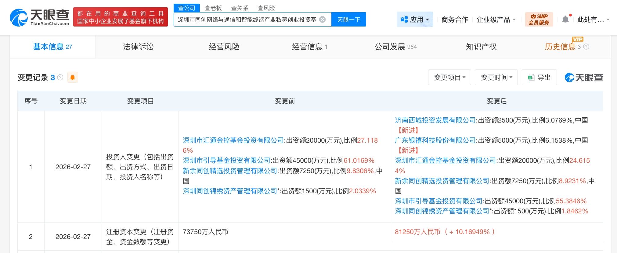天眼查工商信息显示,近日,深圳市同创 *** 与通信和智能终端产业私募创业投资基金合伙企业(有限合伙)发生工商变更,新增银禧科技(300221)、济南西城投资发展有限公司为合伙人,同时,出资额由约7.4亿人民币增至约8.1亿人民币,增幅约10%。