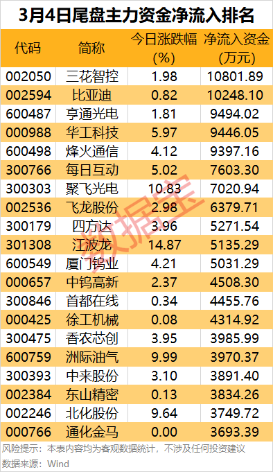 从个股来看,11股尾盘主力资金净流入金额均超5000万元,三花智控(002050)和比亚迪(002594)尾盘主力资金净流入均超1亿元。