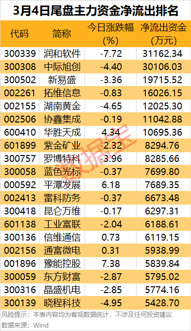据数据宝统计,7股尾盘主力资金净流出金额均超1亿元。润和软件(300339)和中际旭创尾盘净流出金额均超3亿元;新易盛、拓维信息(002261)、湖南黄金(002155)和协鑫集成(002506)等尾盘主力资金净流出金额居前。
