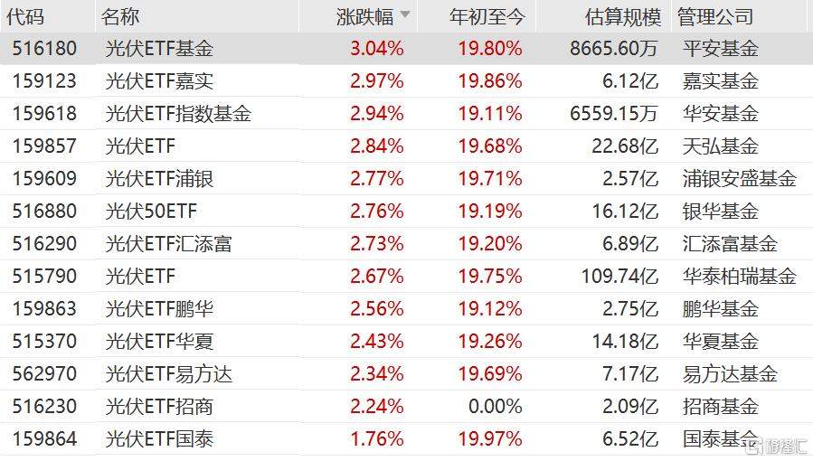 光伏股午后集体拉升,晶科能源20cm直线涨停,欧普泰涨超25%,协鑫集成、天合光能涨超8%。光光伏ETF基金涨超3%,伏ETF指数基金、光伏50ETF、光伏ETF、光伏ETF嘉实、光伏ETF华夏、光伏ETF易方达、光伏ETF国泰、光伏ETF鹏华、光伏ETF招商等上涨。