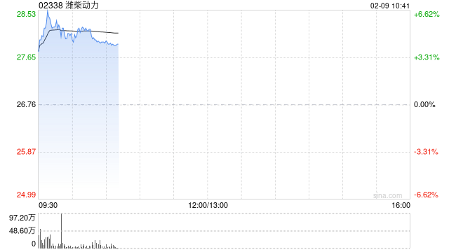 潍柴动力(02338)盘中涨超5%,截至发稿,股价上涨4.26%,现报27.90港元,成交额2.33亿港元。
