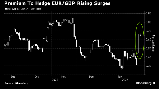 就像11月预算案时的价格走势一样,期权交易员更倾向于把欧元作为集中应对英国特有风险的更佳工具。上周,对冲英镑兑欧元在未来一个月下跌风险相比对冲上涨风险的溢价升至11月下旬以来的更高水平,也创7月以来的更大涨幅。