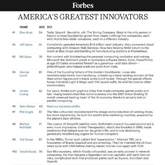 福布斯发布“美国250位最伟大创新者”榜单,马斯克位居之一
