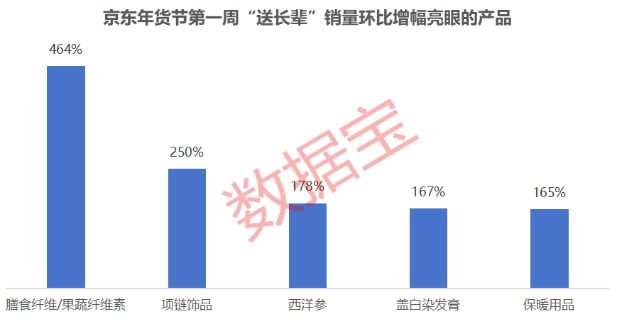 纵向来看,从“送长辈”年货销量变动来看,多款产品在年货节期间销量增幅亮眼。环比增幅位居首位的是膳食纤维/果蔬纤维素,环比增幅高达464%;其次是项链饰品,环比增幅高达250%;另外,保暖用品销量环比增幅也高达165%。