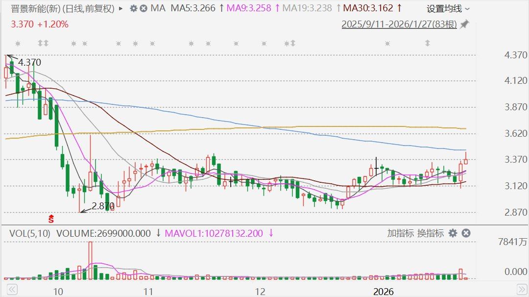 继昨日收涨超5%后,晋景新能(1783.HK)今日继续走强,盘初拉升涨3.3%报3.44港元,2连升,股价创2025年10月20日以来新高。