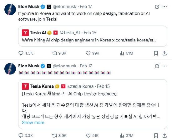 马斯克在帖文中写道:“若想在韩国从事芯片设计、晶圆制造和人工智能软件相关工作,欢迎应聘特斯拉”,并附上了韩国国旗表情。