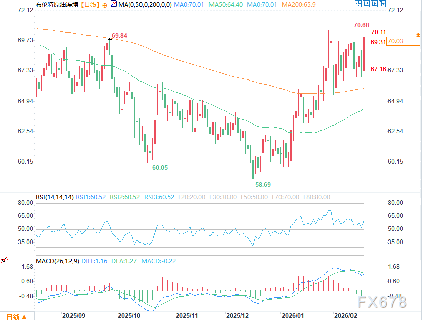 技术面核心聚焦布伦特原油69美元/桶价位――该价位既是近期关键突破位,也是核心支撑位。受美方强硬表态推动,过去4小时内布伦特原油涨至69.98美元/桶,成功站稳支撑位上方,短期偏多技术结构得到强化。