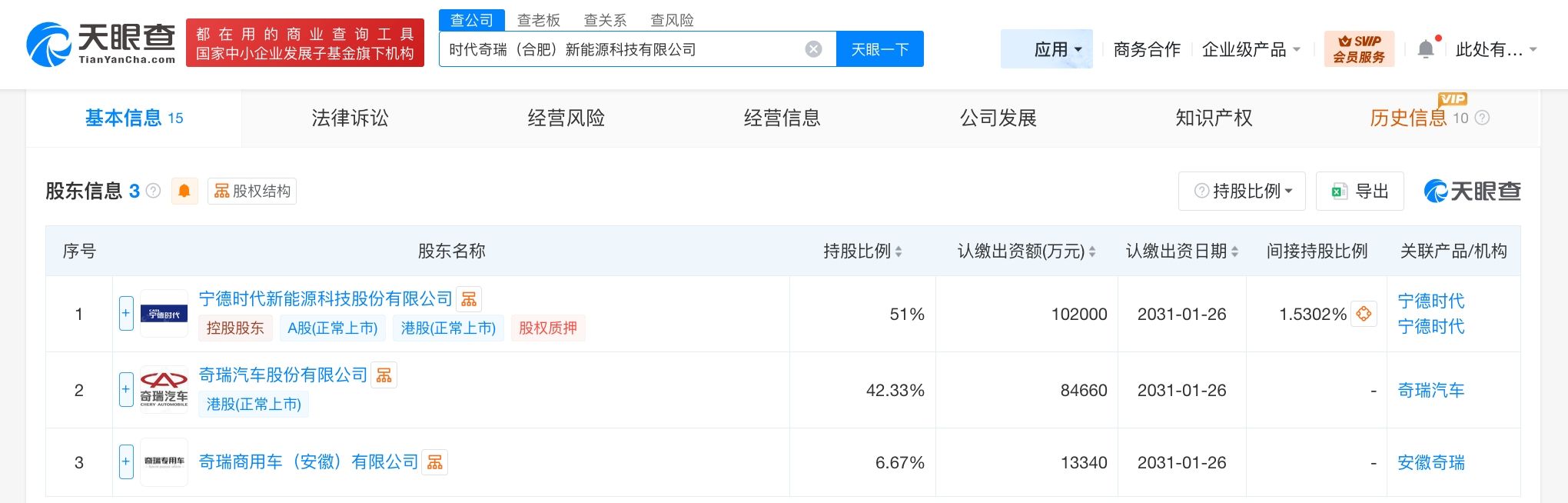 天眼查App显示,近日,时代奇瑞(合肥)新能源科技有限公司成立,法定代表人为来永杰,注册资本20亿人民币,经营范围为电池制造,电池零配件生产,电池销售,电池零配件销售,储能技术服务,技术服务、技术开发、技术咨询、技术交流、技术 *** 、技术推广,货物进出口。股东信息显示,该公司由宁德时代(300750)、奇瑞汽车股份有限公司、奇瑞商用车(安徽)有限公司共同持股。