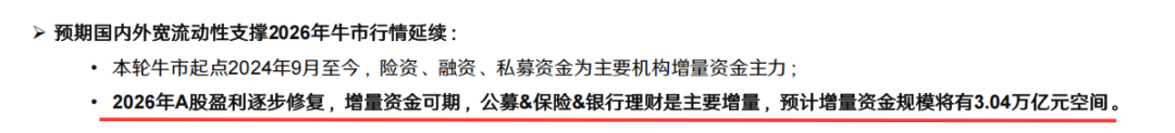 据券商研报预计,随着2026年A股盈利逐步修复,增量资金可期,公募、保险、银行理财是主要增量,预计增量资金规模将有超过3万亿元空间。