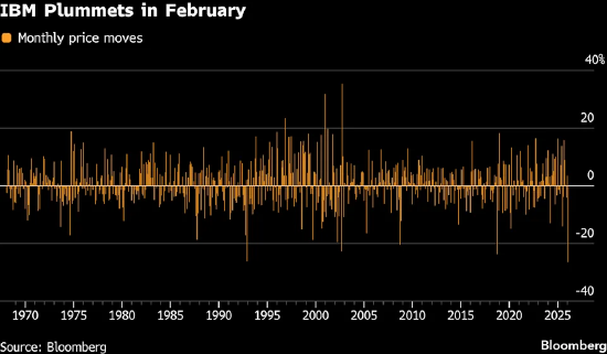 该股暴跌13%,为2000年10月以来更大单日百分比跌幅。彭博社汇编数据显示,受此次下跌影响,IBM股价2月份已累计下跌27%,有望创下至少1968年以来更大单月跌幅。