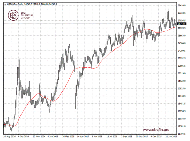 恒生指数持续在50日均线上方运行,但持续的盘整态势表明其上涨动能正在减弱。我们预计短期内该指数将跌破26,600点关口。