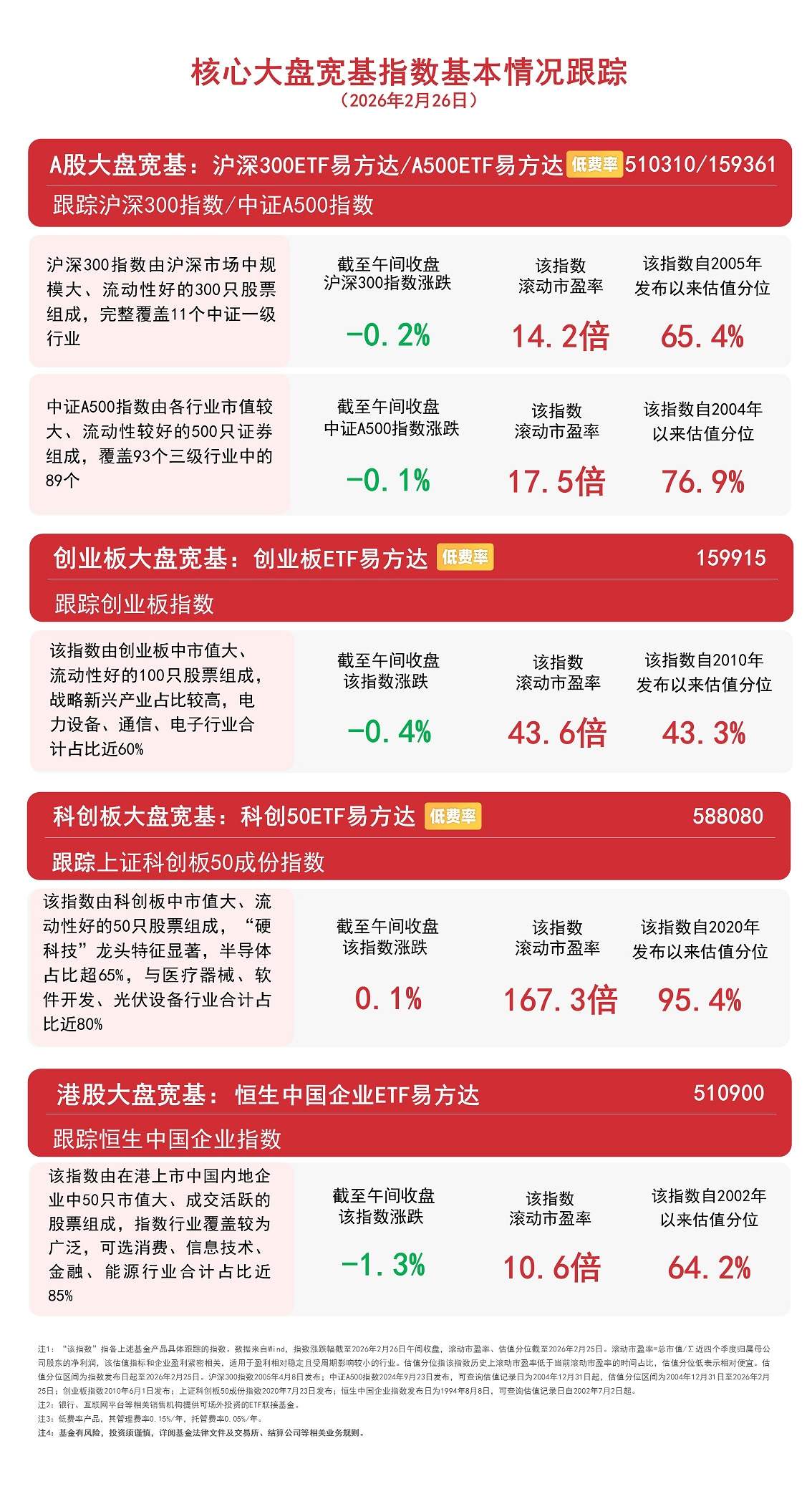截至午间收盘,中证A500指数下跌0.1%,沪深300指数下跌0.2%,创业板指数下跌0.4%,上证科创板50成份指数上涨0.1%,恒生中国企业指数下跌1.3%。