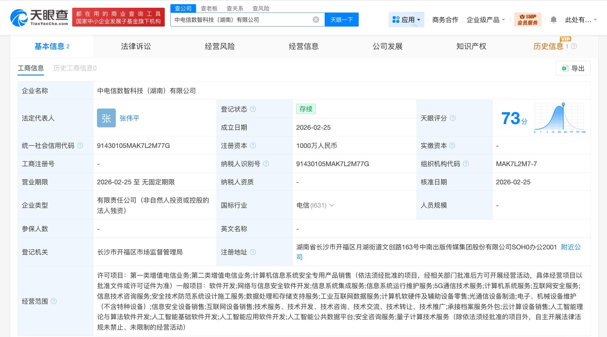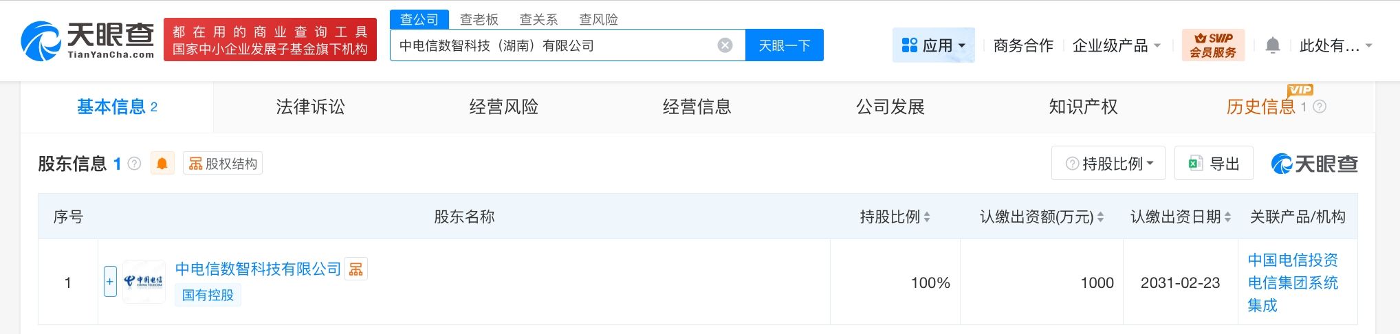 天眼查App显示,近日,中电信数智科技(湖南)有限公司成立,法定代表人为张伟平,注册资本1000万人民币,经营范围含之一类增值电信业务、第二类增值电信业务、计算机信息系统安全专用产品销售、软件开发、 *** 与信息安全软件开发、信息系统集成服务、信息系统运行维护服务、5G通信技术服务等,由中国电信旗下中电信数智科技有限公司全资持股。
