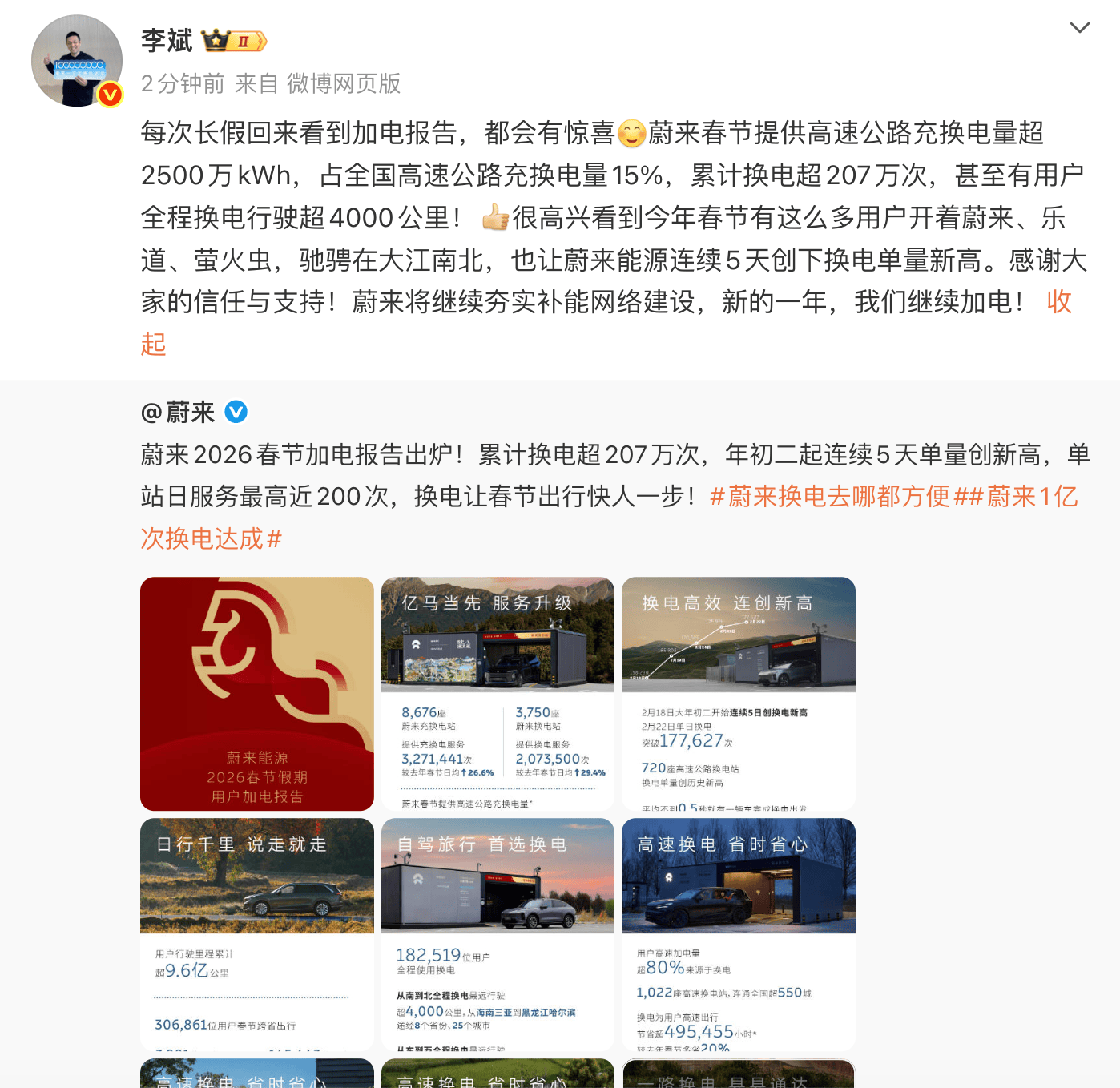 对此,蔚来汽车创始人、董事长、CEO李斌发文回应:“每次长假回来看到加电报告,都会有惊喜。很高兴看到今年春节有这么多用户开着蔚来、乐道、萤火虫,驰骋在大江南北,也让蔚来能源连续5天创下换电单量新高。感谢大家的信任与支持。蔚来将继续夯实补能 *** 建设,新的一年,我们继续加电。“